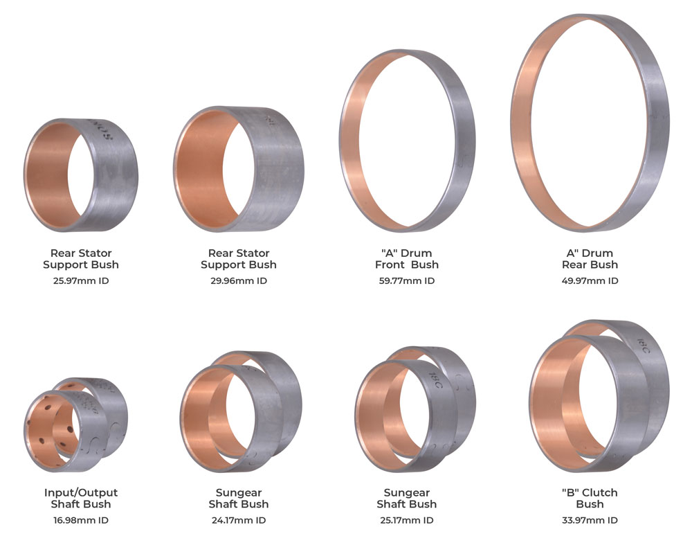 OE bushings in ZF6HP26 and ZF6HP28 units have a tendency to wear out prematurely due to sub-optimal material composition. This wear can lead to bushing failure, loss of correct pressure to the E-clutch and B-clutch, and gear ratio or solenoid codes. Sonnax offers improved bushing kit to restore worry-free operation.