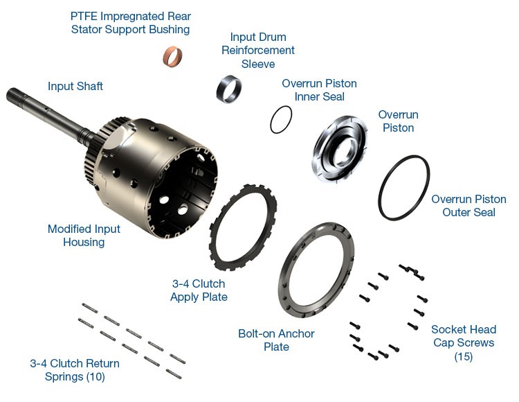 This Sonnax Smart-Tech input housing kit makes room for a taller clutch pack anchored in place by a stronger backing plate — the most reliable way to increase clutch capacity and protect against destructive heat.