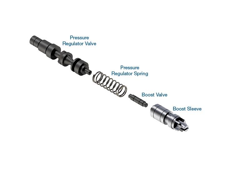 Vehicles equipped with 09G,09K,09M, 6F21WA, TF60SN transmissions often develop erratic or high line pressure due to excessive wear in the OE pressure regulator valve bore and/or boost valve and sleeve. This wear allows critical oil loss, preventing proper line pressure regulation. Without correct balance oil pressure, the PR valve will be out of its desired position, resulting in line pressure instability and possibly restricting cooler and lube flow to the secondary regulator valve. A deteriorated bore can cause lowered line pressure, resulting in soft shifting and burnt clutches. Reconditioning the bore and installing Sonnax oversized pressure regulator valve and boost valve kit restores proper line pressure and cooler flow.